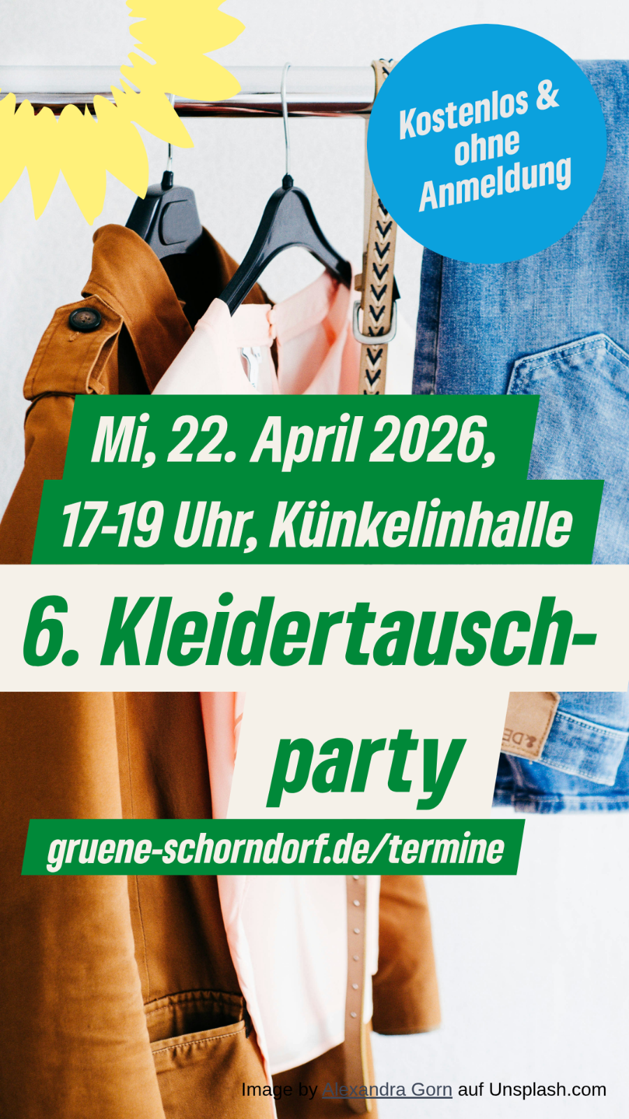 Wir veranstalten unsere 6. Kleidertauschparty! Am 22. April 2026 in der Barbara-Künkelin-Halle von 17-19 Uhr: Einfach Kleidung mitbringen und nach neuen Lieblings-Teilen stöbern. Kostenlos und ohne Anmeldung.