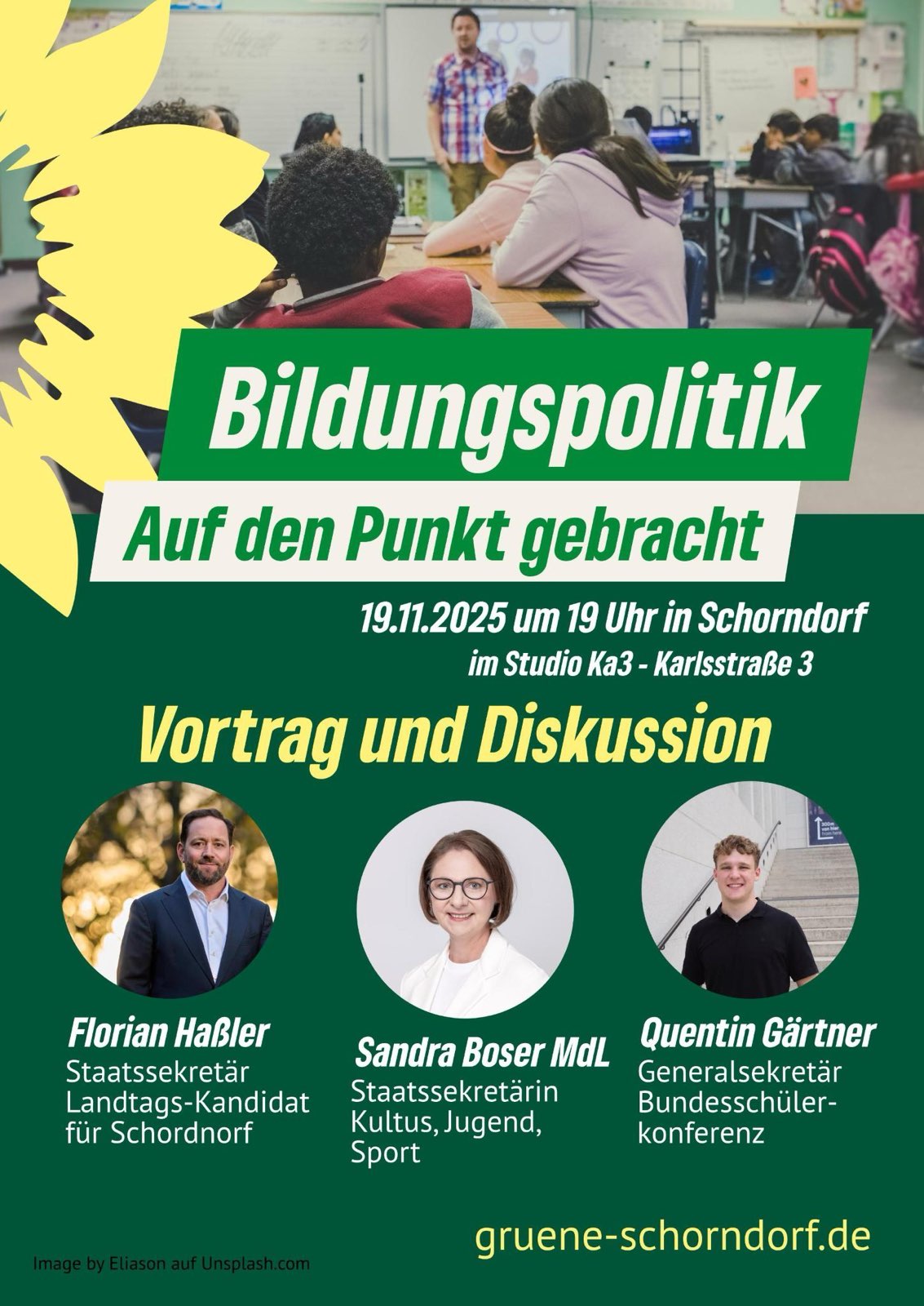 Unter dem Titel „Bildungspolitik – Auf den Punkt gebracht“ laden die Grünen Schorndorf am Mittwoch, 19. November 2025, um 19 Uhr zu einem Vortrag mit anschließender Diskussion ins Studio Ka3 (Karlstraße 3, Schorndorf) ein.
